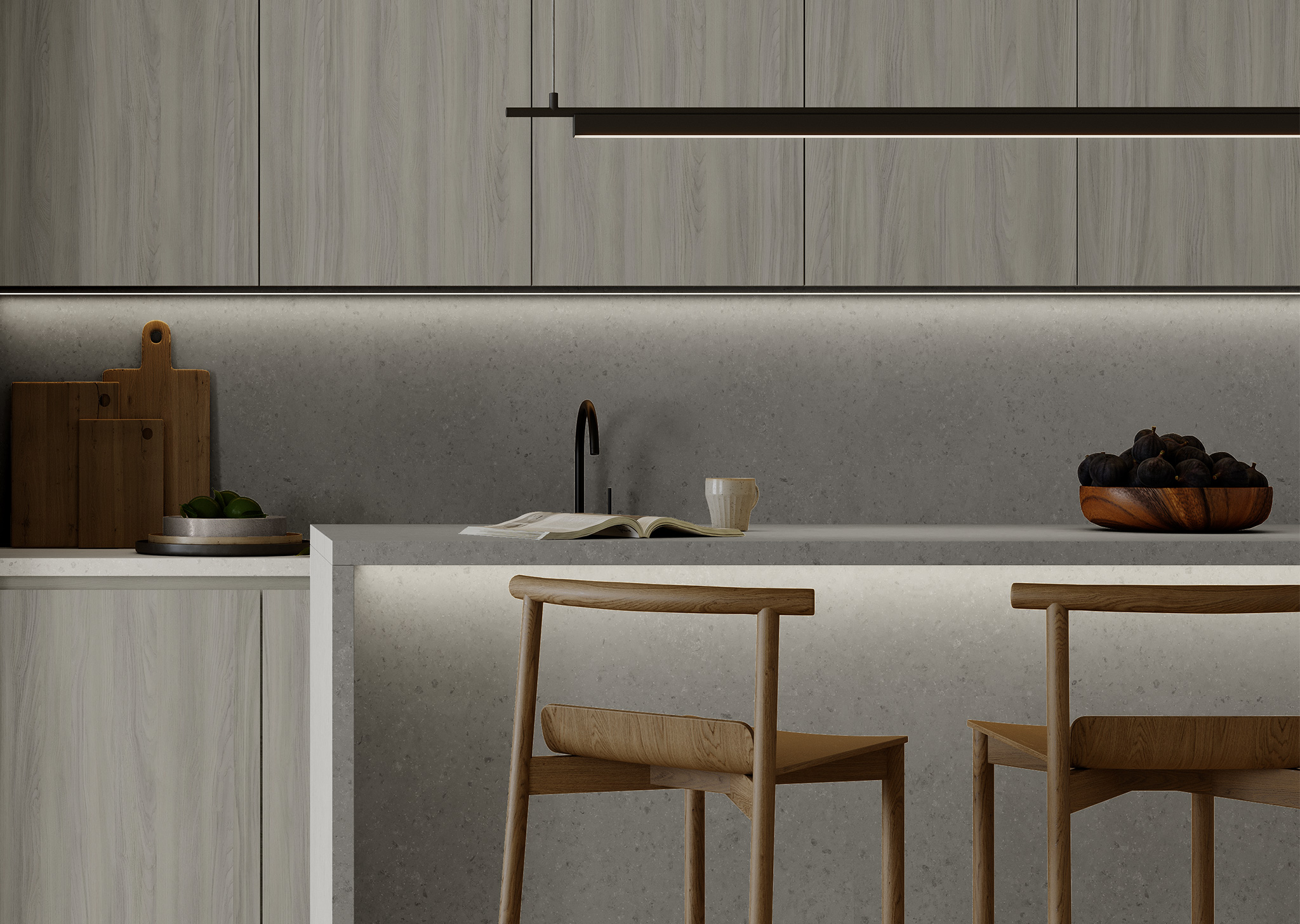 This range fits perfectly with the growing trend towards worktops with reduced thicknesses in kitchens, in particular 13 mm. Fintop Xtrim combines a slim, high-performance board with this design, with decorative options in both wood and stone finishes. These designs are combined with three different finishes: Antiq, Balm and Moa. The range also allows for a 'total look', as it is possible to combine the worktop with splashbacks, fronts and panels.