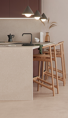 Worktop with straight edgebanding and thickness of 38 mm. Gravity Marengo is a limestone in an anthracite tone. It is the result of mixing slate, granite and micro-terrazo. The Moa texture brings great naturalness to this design. This worktop belongs to our new Fintop SQ range.