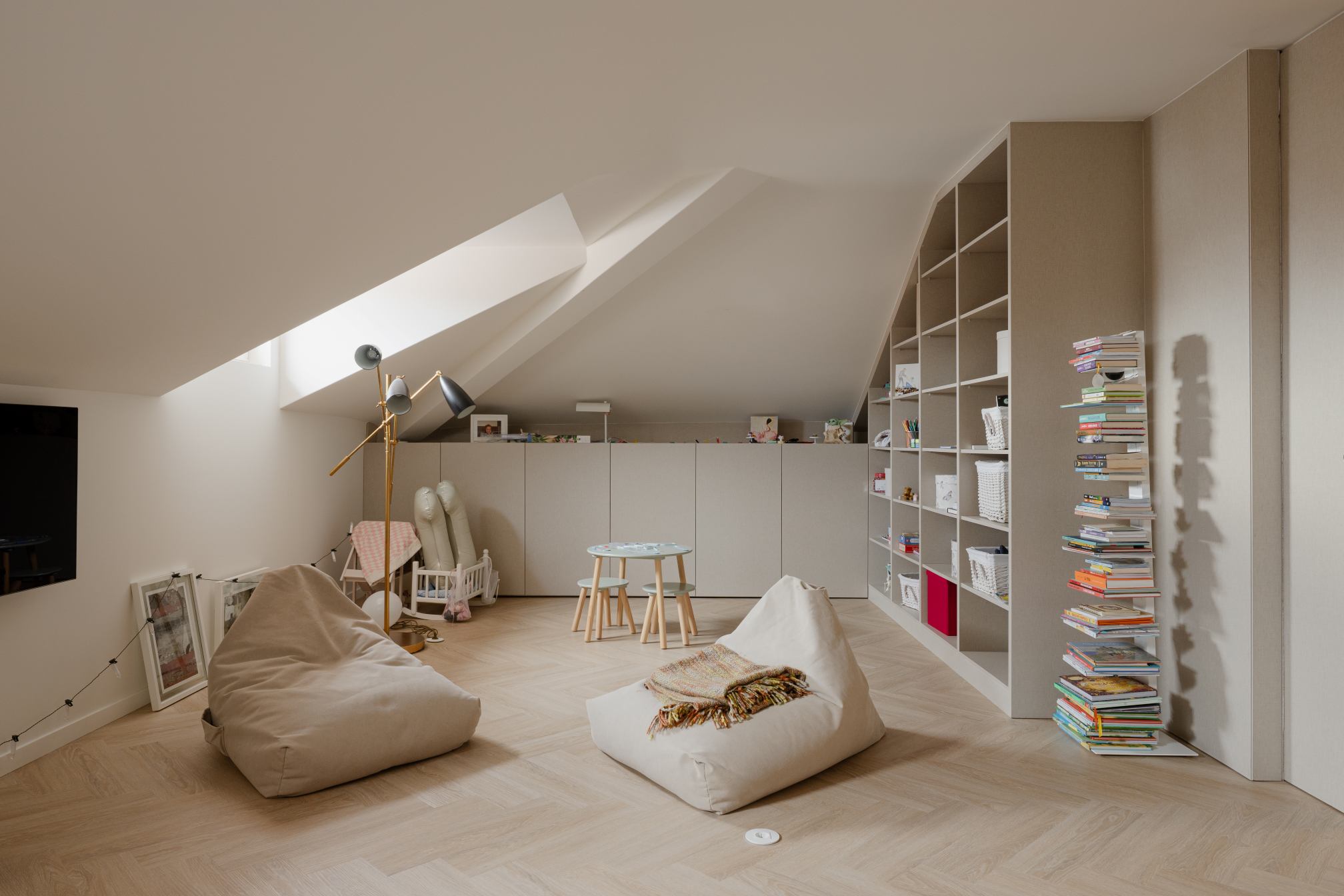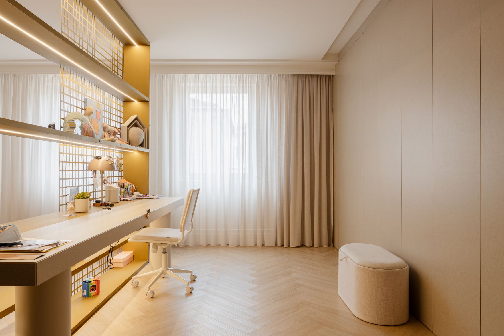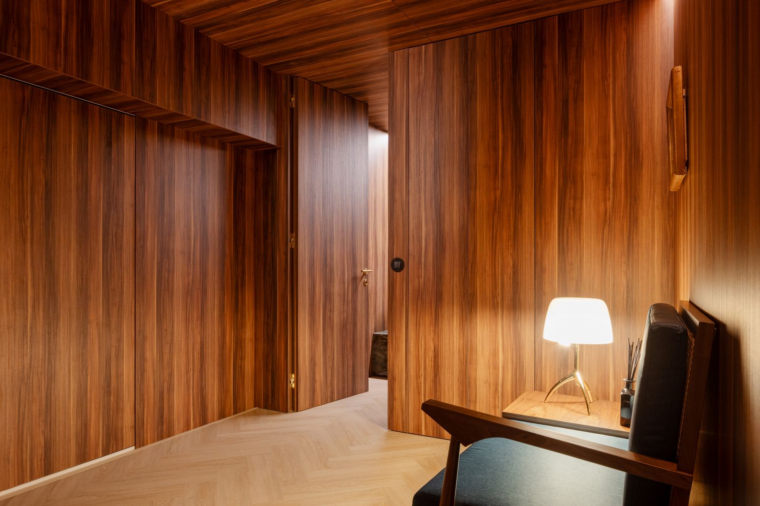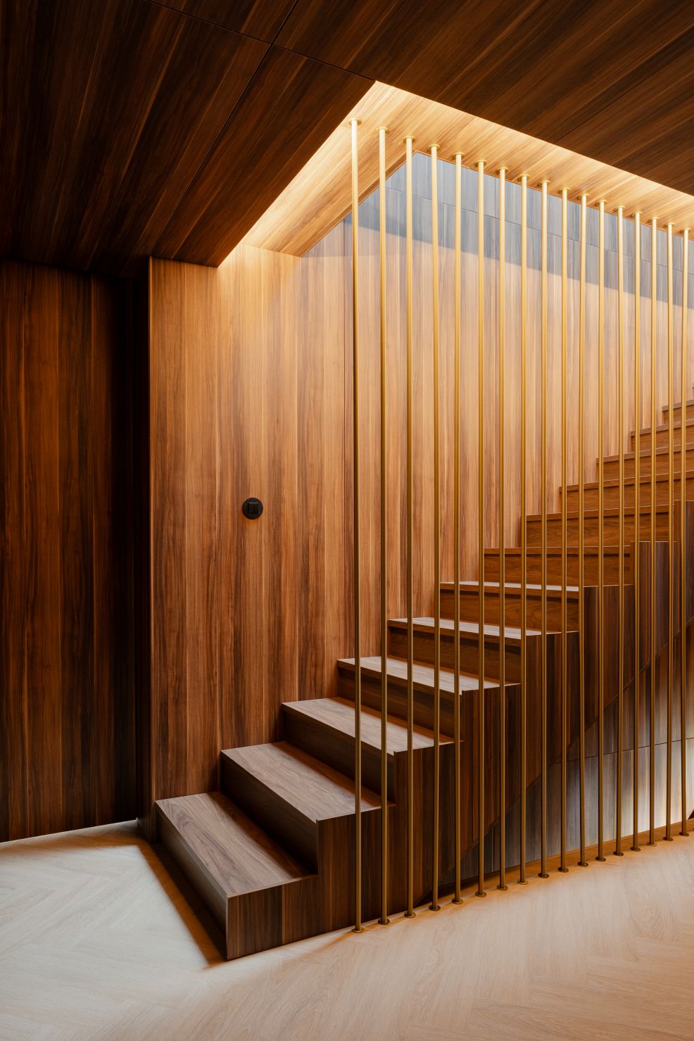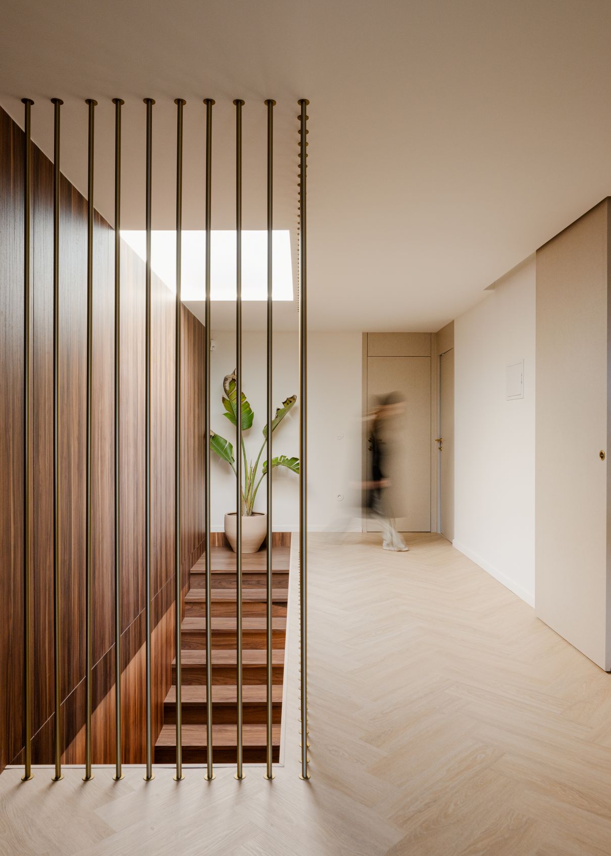 The staircase, a sculptural piece of wood and golden slats, is the visual heart that fluidly connects the levels. In the bedrooms, wood, luminous lacquers, and textile textures create serene refuges.