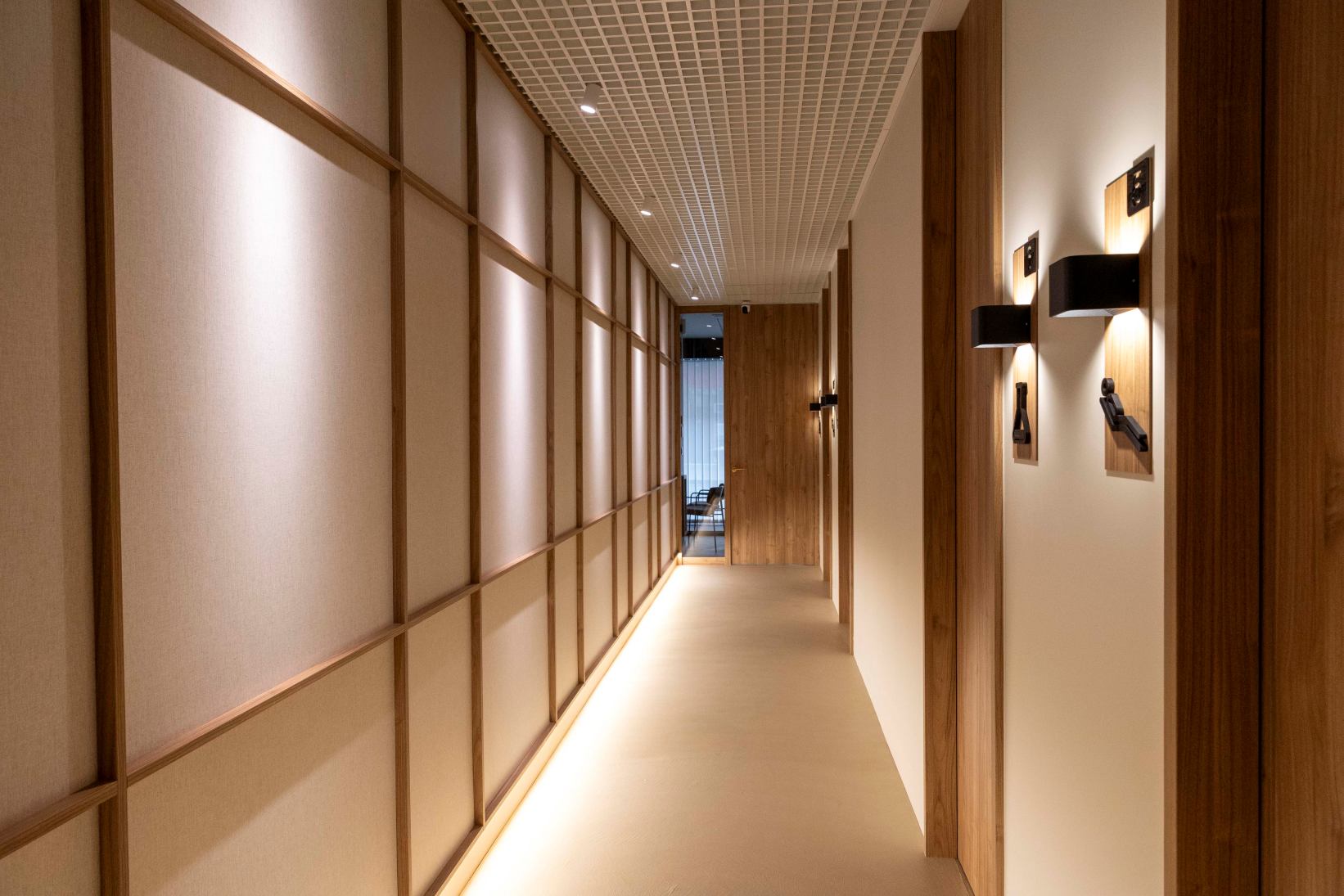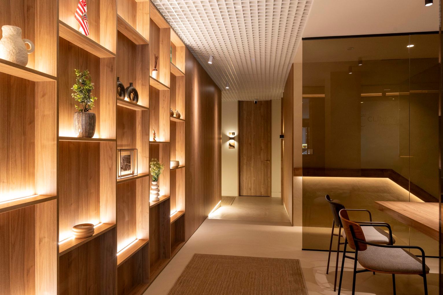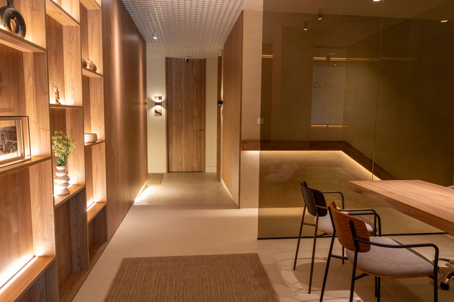 The reception, with its marble counter and Nogal Slow Atlas panelling, offers a sophisticated welcome. Indirect lighting enhances the warmth of the wood. Integrated hallways and shelving maintain coherence, with backlit sculptural elements.