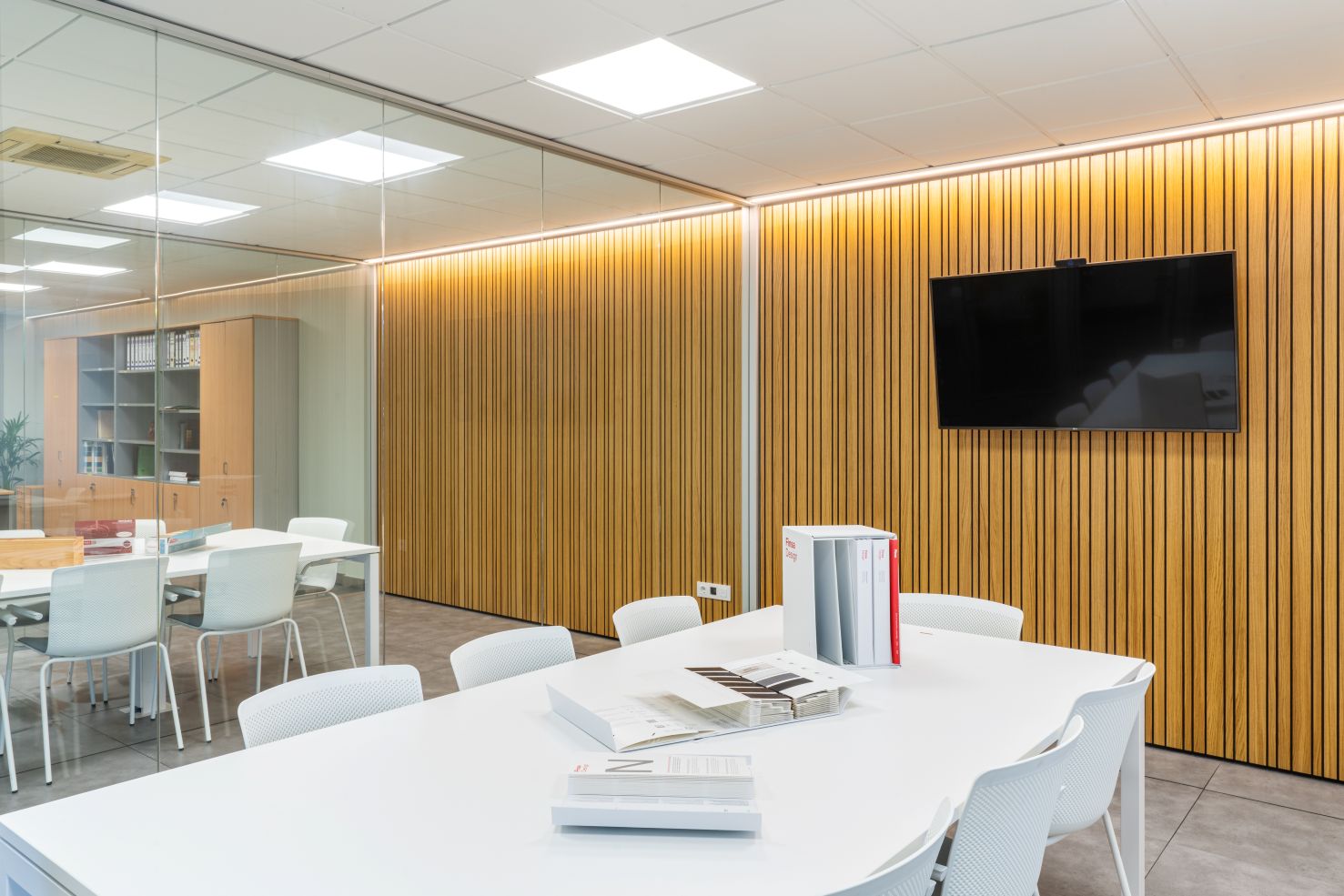 When testing new materials, our own offices can be the ideal place to install the boards and assess their appearance. Thus, in 2023, the need to renovate some meeting rooms at the Finsa factory in Padrón (A Coruña) allowed us to showcase our FibraColour® Negro Natur Oak grooved board. Specifically, it was applied to the panelling of the rooms.