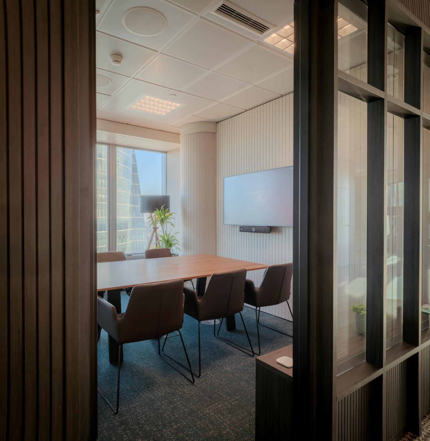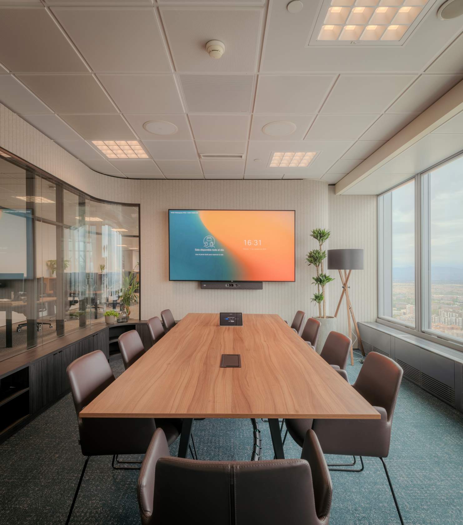 From the panelling that dresses the walls to the screens that sculpt the space, each element, including FibraColour® Negro EZ with the decorative Boreal Roble Mina, along with vibrant accents such as Verde Glencoe and Cashmere Technical Matt, among others, contributes to a visual symphony.