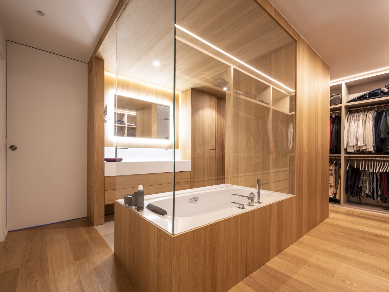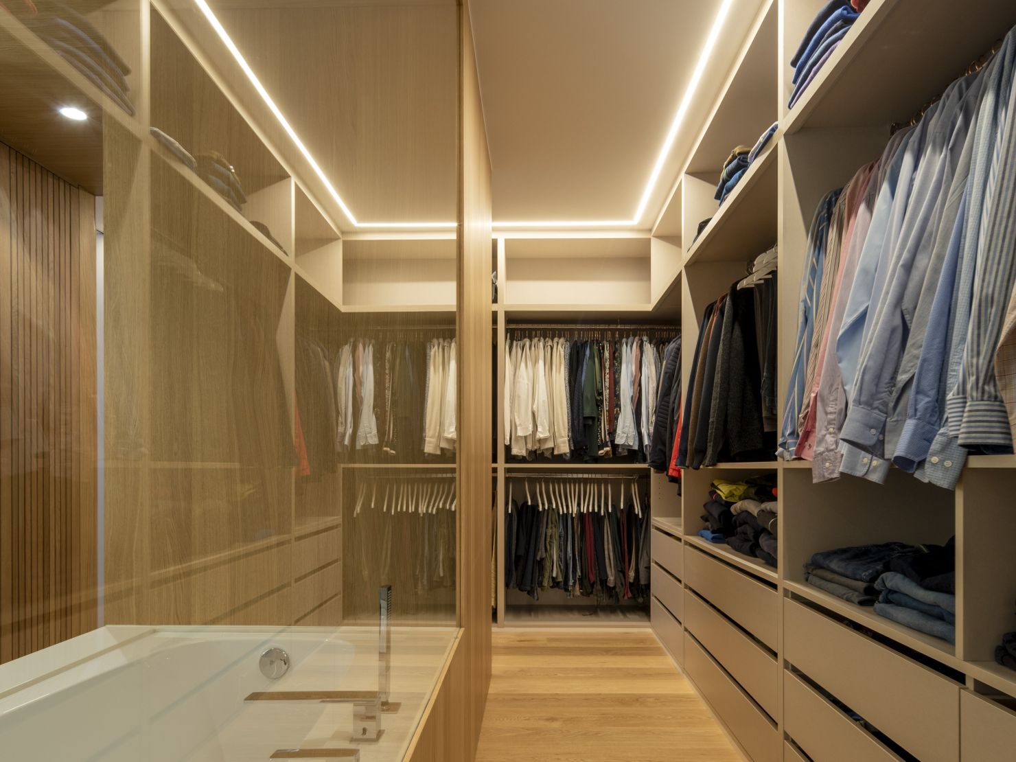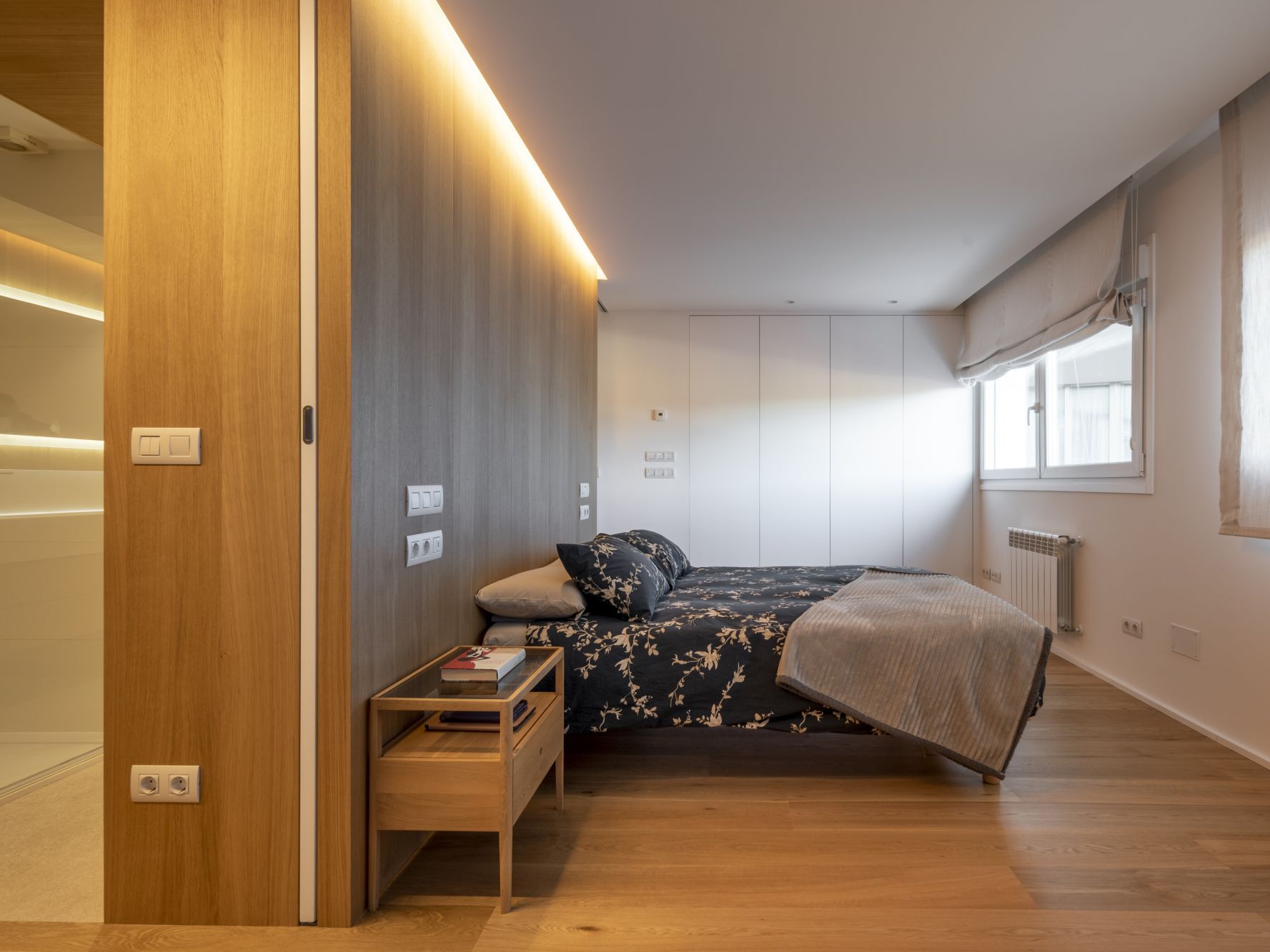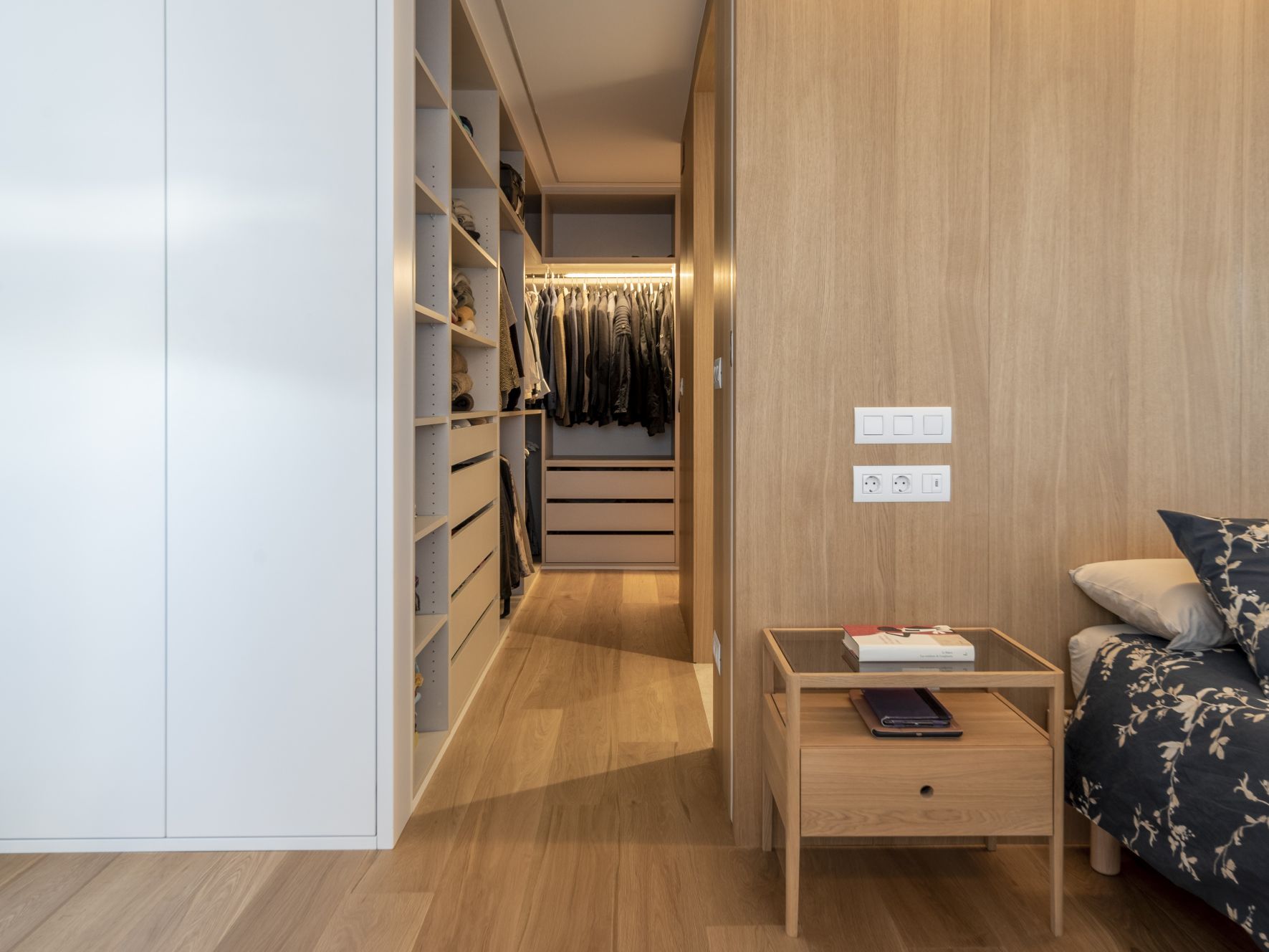 But, without a doubt, the crown jewel of this home is found when we access the area that comprises the main bathroom, the splendid dressing area and the bedroom. The toilet area is located in a central cube covered with Roble Alba veneer, a piece completely surrounded by shelves and drawers that allow for the storage of large amounts of clothing. The entire dressing area has been made with SuperPan® Decor Perla Soft III. Finally, in the bedroom,we find once again a large panel in Roble Alba that takes on the role of a headboard.