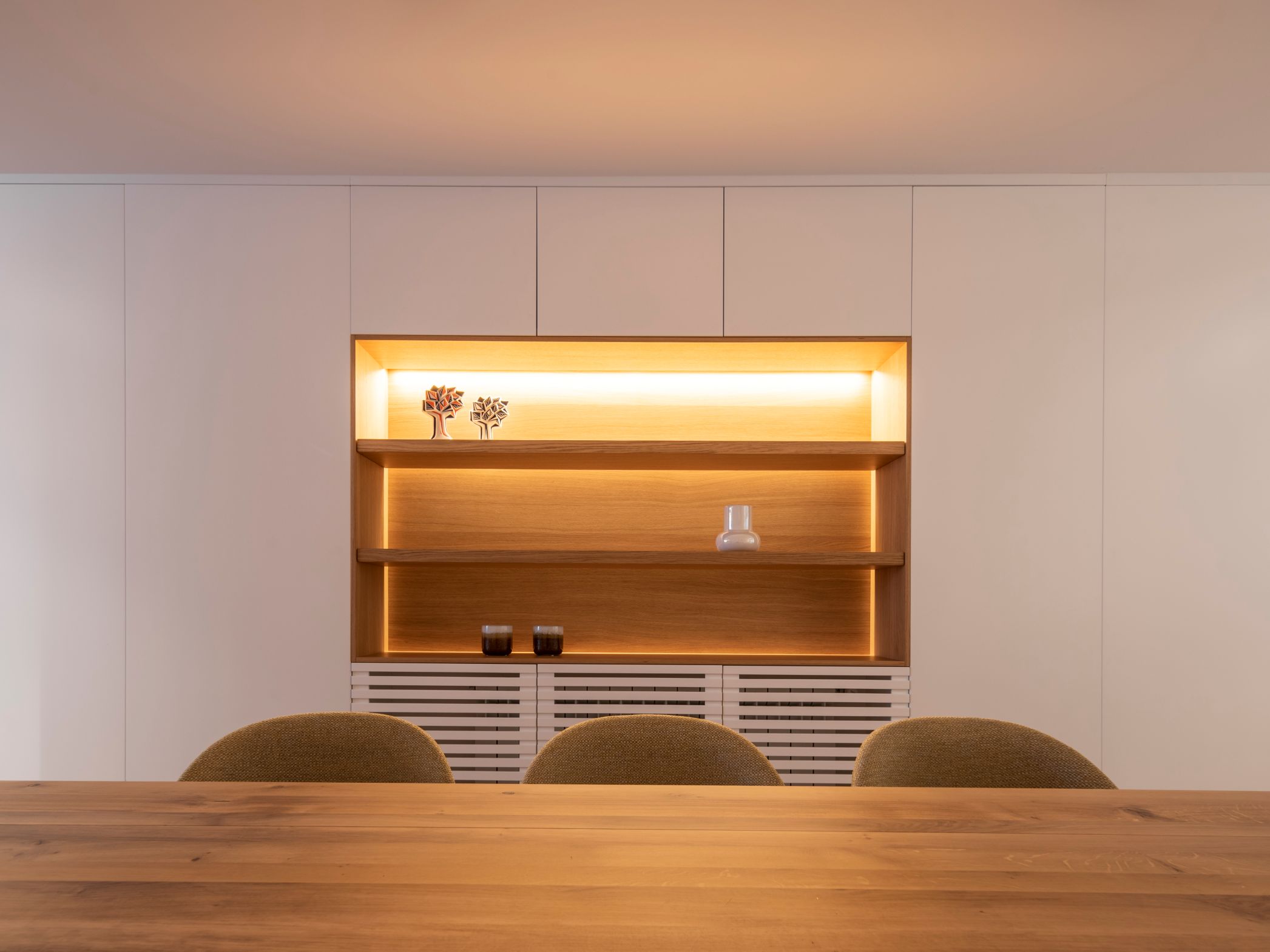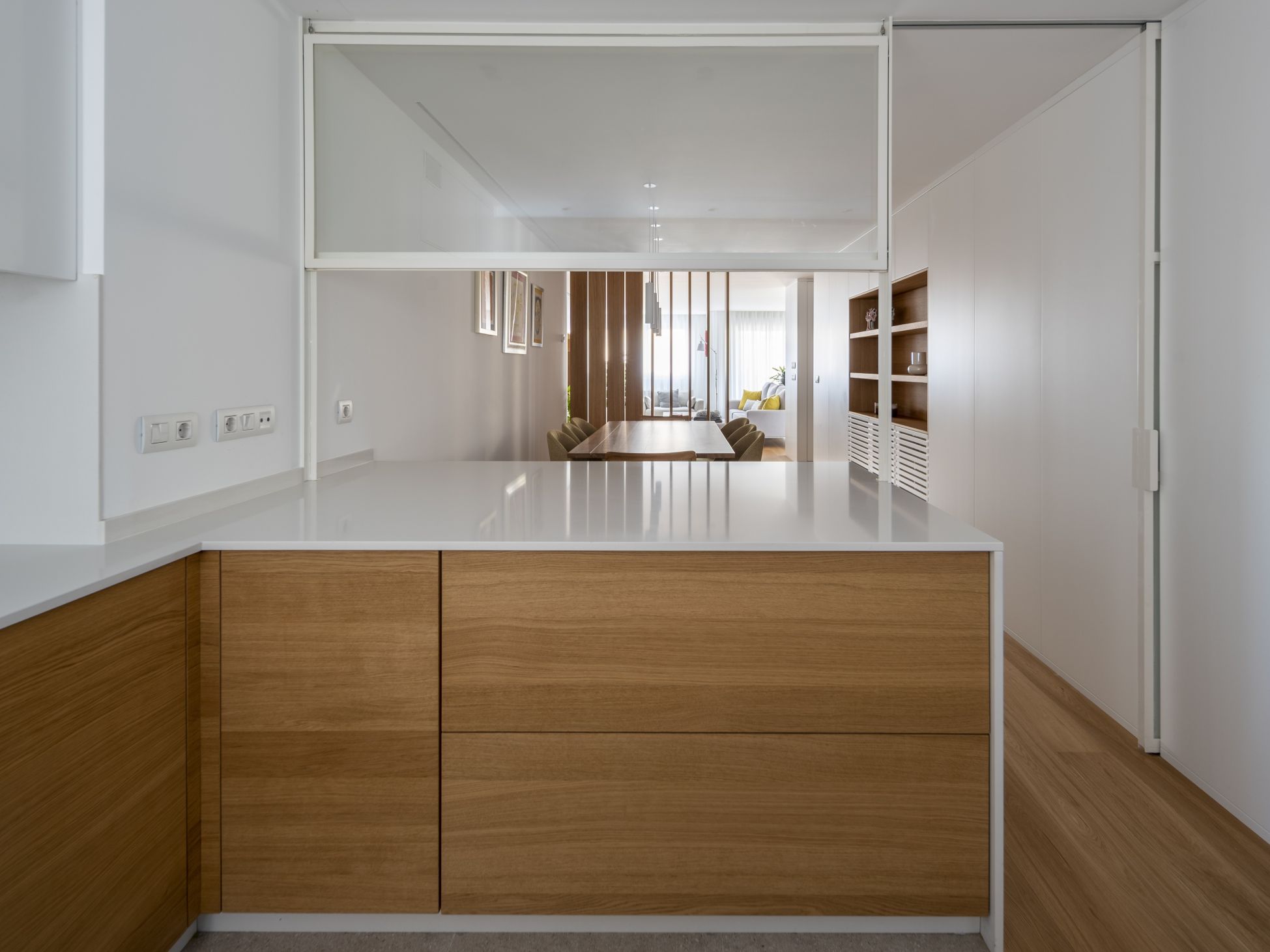 From the living room, we connect to the dining room, where that same Roble Alba veneer is present in the room divider and on the side shelf. From that area, we access the kitchen, where we also find a great prominence of our materials. Thus, we find Roble Alba once again on furniture fronts, this time with FimaPan® H support. In the upper cabinets, the fronts are made of white lacquered FibraPan® H and all interiors are made with SuperPan® Decor White SR209 Soft III.