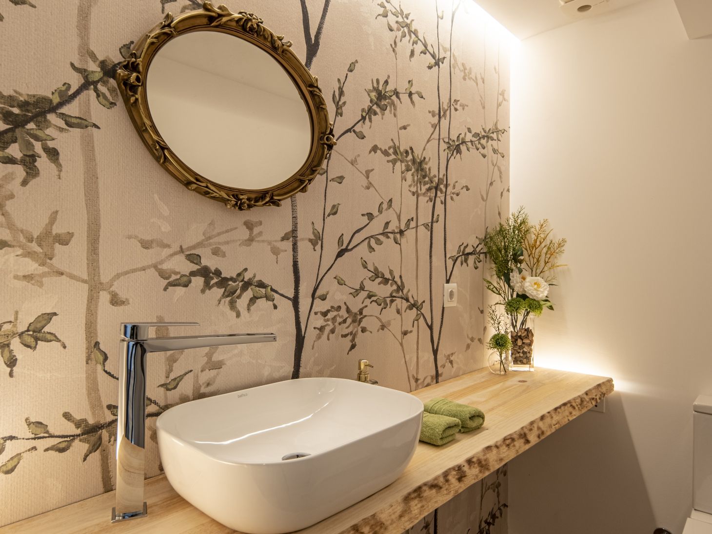 The house also has another bathroom where we find the Savia rustic edge pine worktop, a material that, combined with tree branch wallpaper, brings an original country touch to the house.