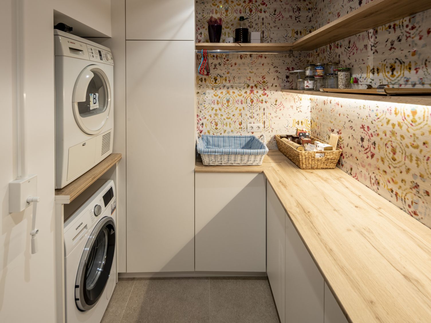Adjacent to the kitchen is a laundry room with furniture made from FimaPan® Decor White SR209 Soft III, countertop Fintop + H Roble Hércules and shelves with that same wooden surface.