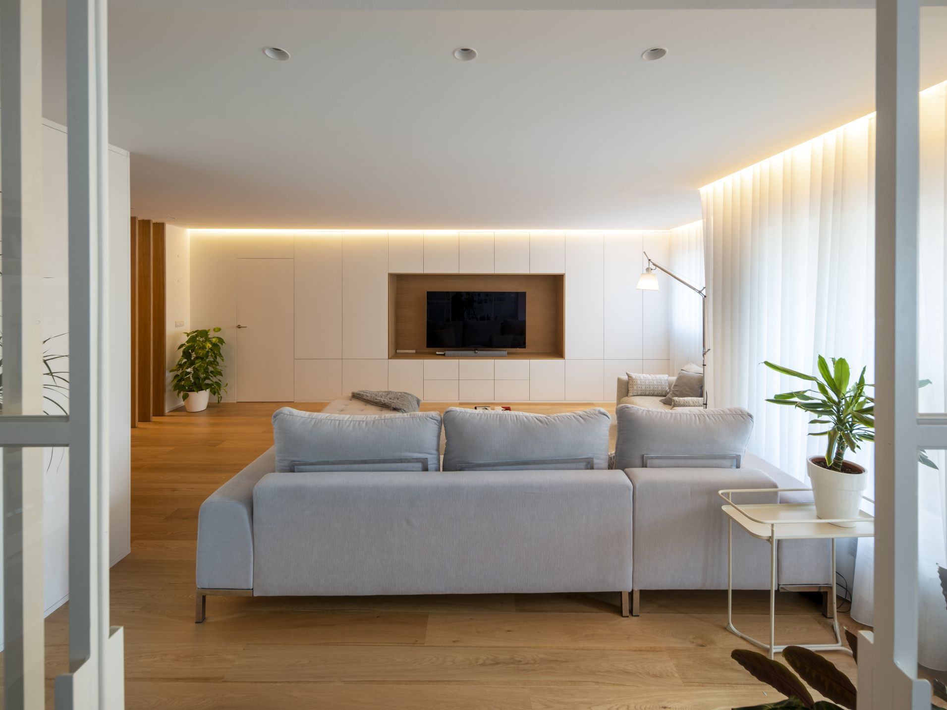 After the renovation, white and oak are the main protagonists. Upon entering the house, after passing through a hallway, we find a spacious living room where one wall is practically white —made in FibraPan® H white lacquered— with a veneer gap Roble Alba for television. Upon opening the doors, we find ample interior storage space, all crafted with FimaPan® Decor White SR209 Soft III, just like the office furniture.