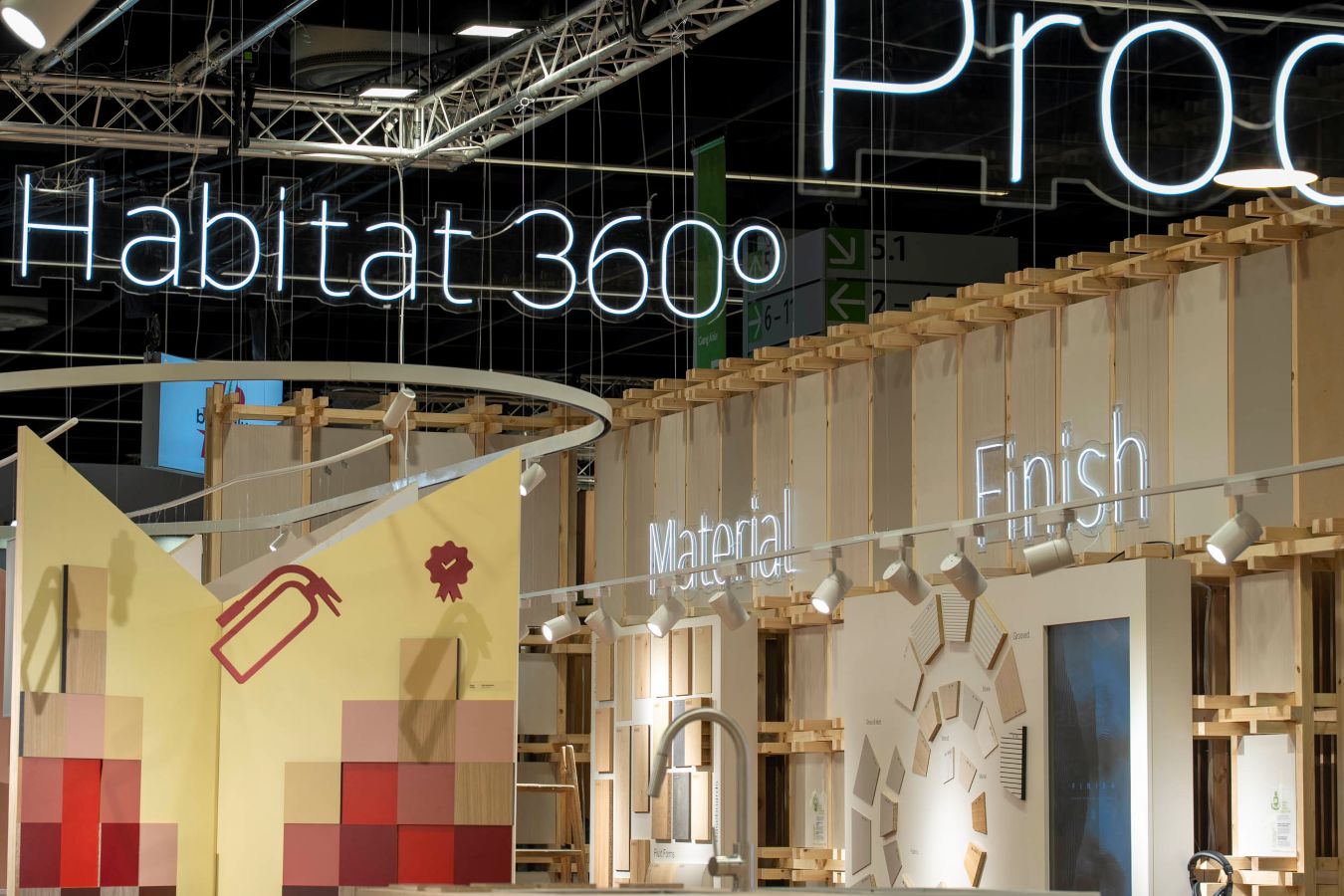 - Cuatro escenografías con soluciones de producto innovadoras para aplicaciones muy específicas, fruto de esta especialización, como son: ignífugos, frentes y lacados, hábitats exteriores y complementos.