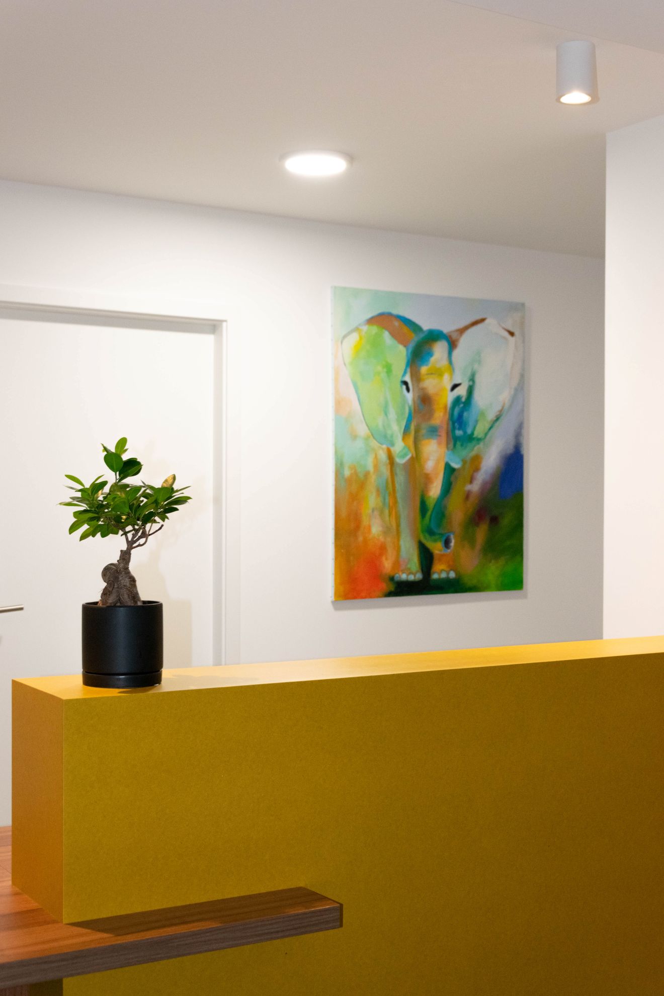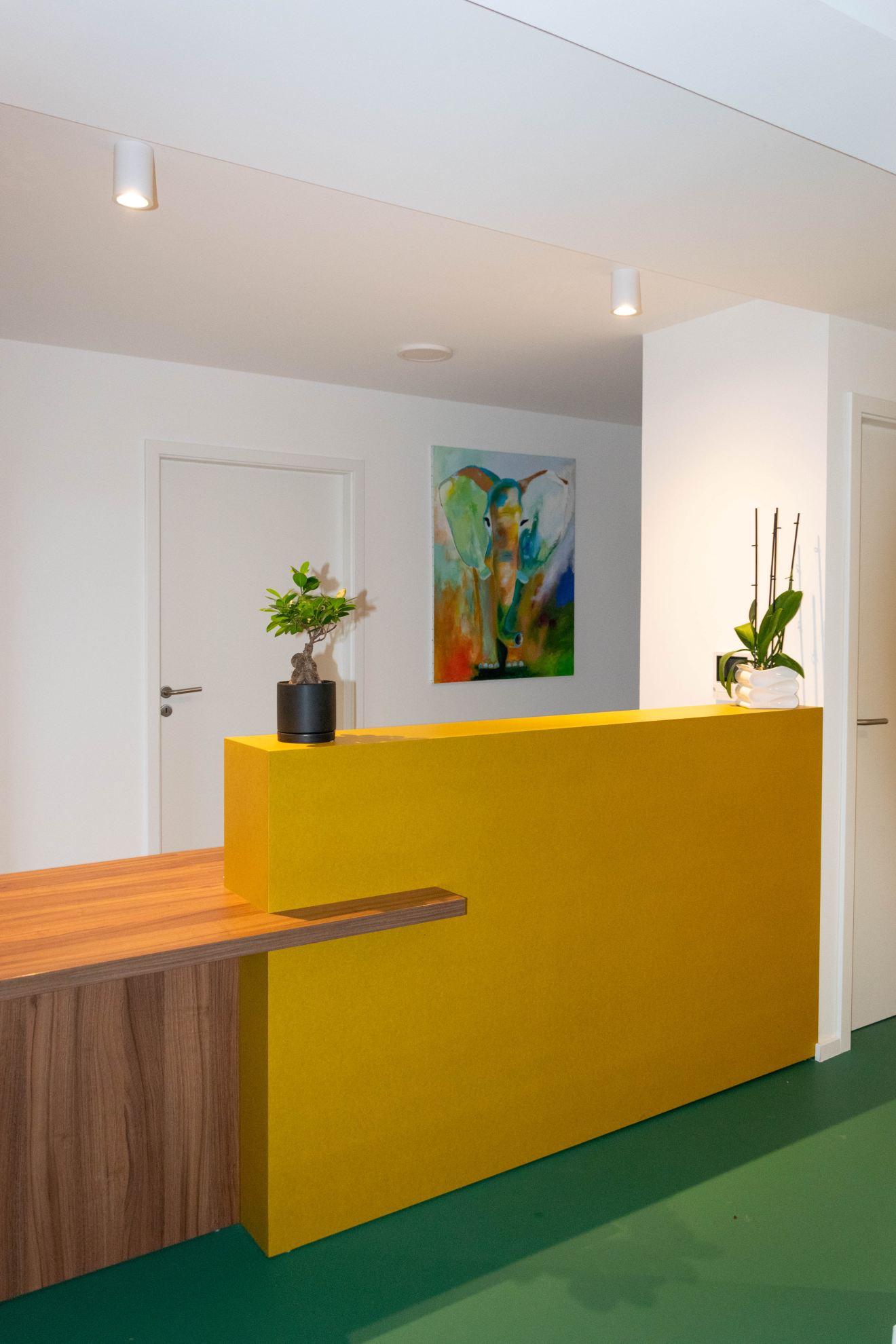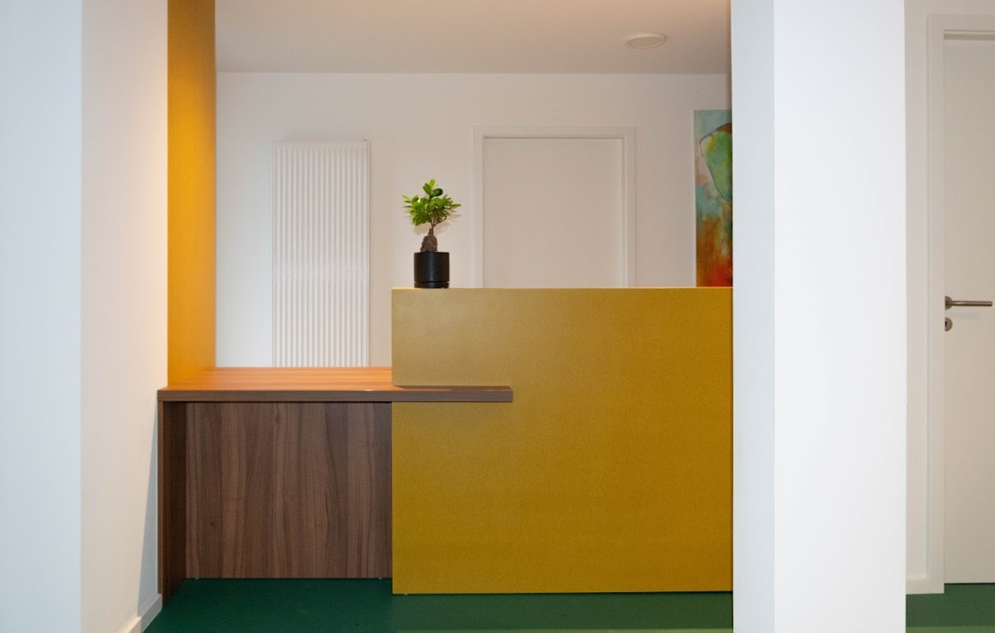 La misma energía se extiende a otras áreas de la clínica a través del mobiliario. Los detalles en FibraColour® EZ Amarillo se integran en armarios y otros elementos funcionales, manteniendo la coherencia estética y aportando un toque moderno. La combinación con superficies de madera más oscura y texturas en el suelo crea un contraste visual atractivo, sin restar protagonismo al color principal.