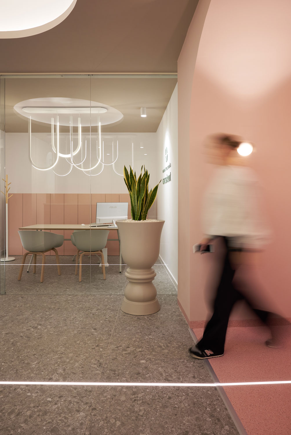 Esta gama cromática se ve acompañada de una integración biofílica de patrones vegetales y texturas pétreas, así como de la predominancia de la luz natural, especialmente en el patio preexistente, mantenido en el proyecto gracias a un cerramiento de vidrio. De esta manera se brinda un extra de optimismo a la zona donde se albergan los gabinetes dentales y las áreas médicas, el corazón del trato con pacientes.