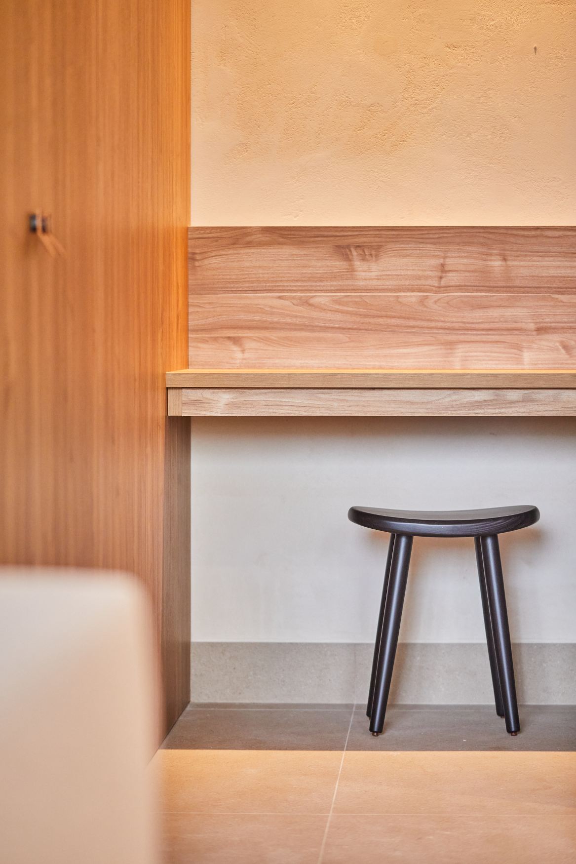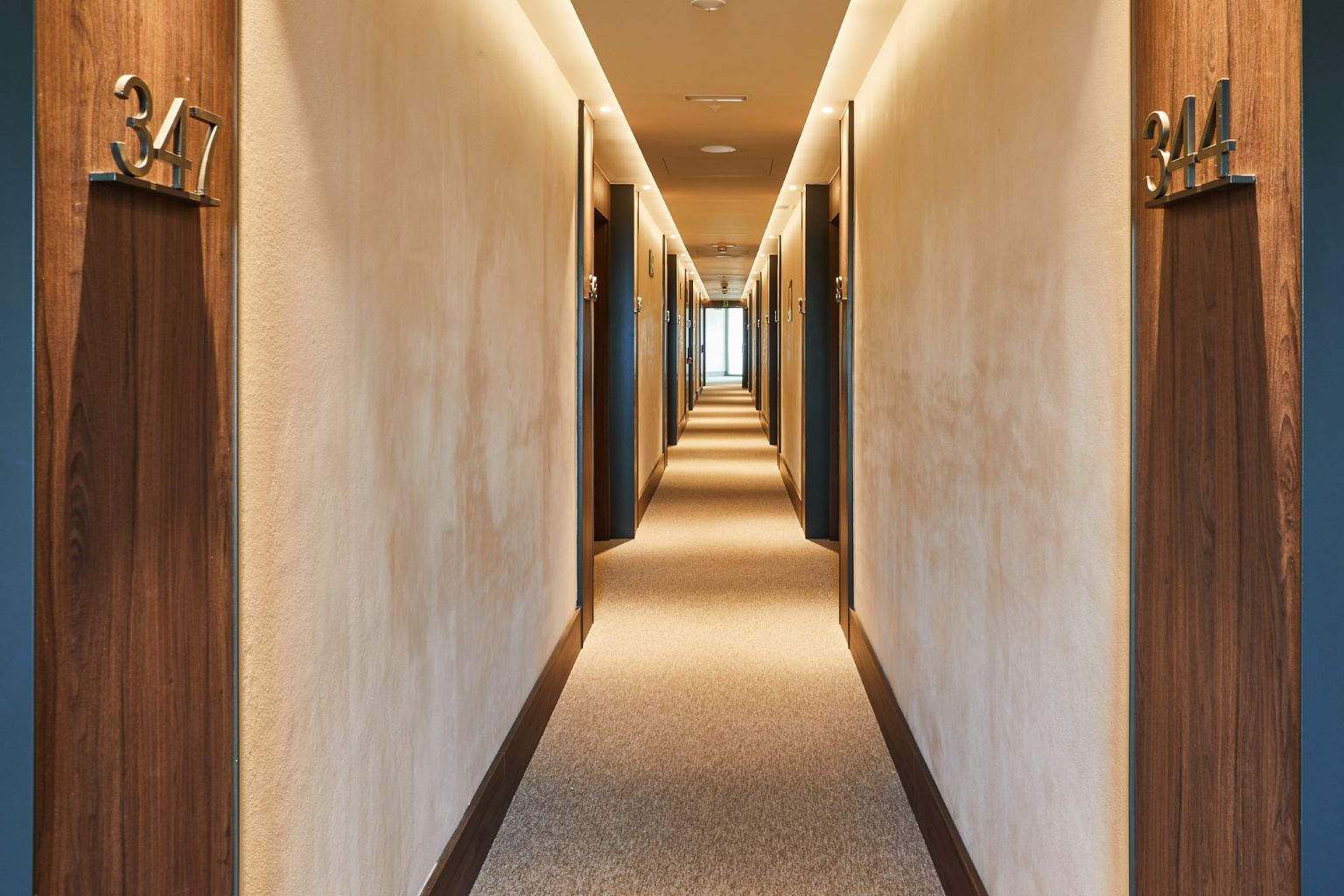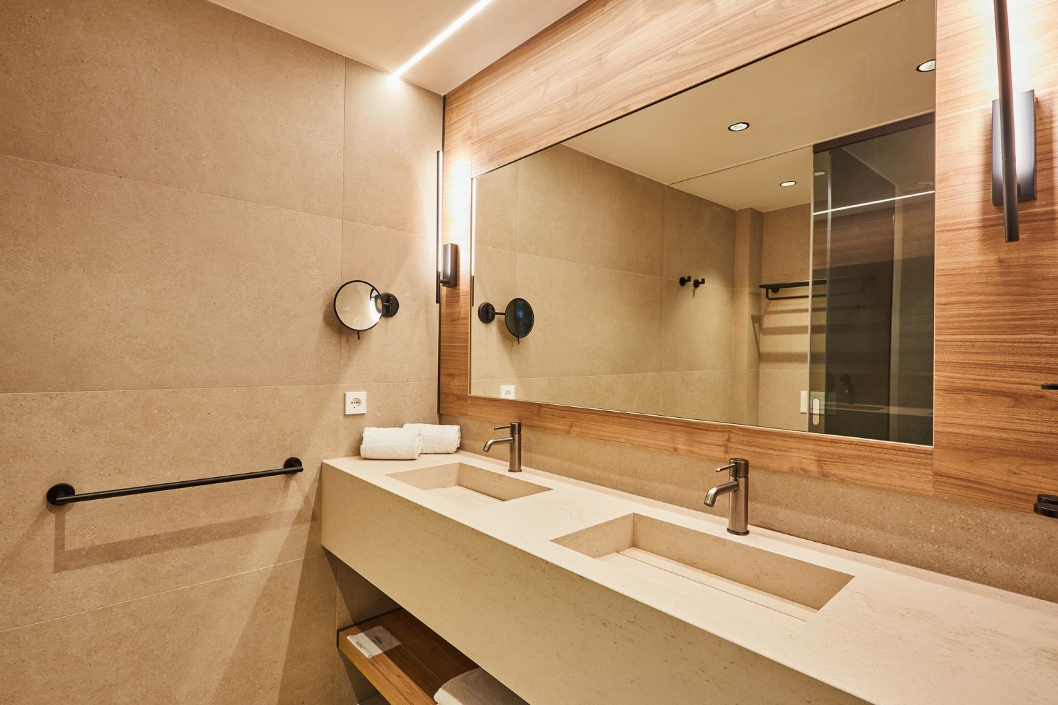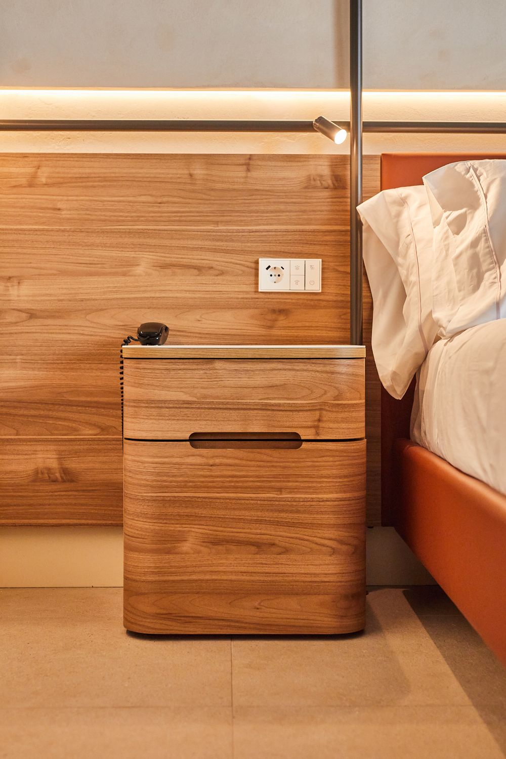 En las habitaciones, el confort es primordial. La madera se utiliza en cabeceros, armarios y mobiliario auxiliar, proporcionando un entorno sereno y funcional. Los baños mantienen la estética del resto del hotel, con la madera en los marcos de espejos y detalles que complementan las superficies claras. Los pasillos, con puertas paneladas, guían a los huéspedes a través de un espacio bien iluminado y ordenado.