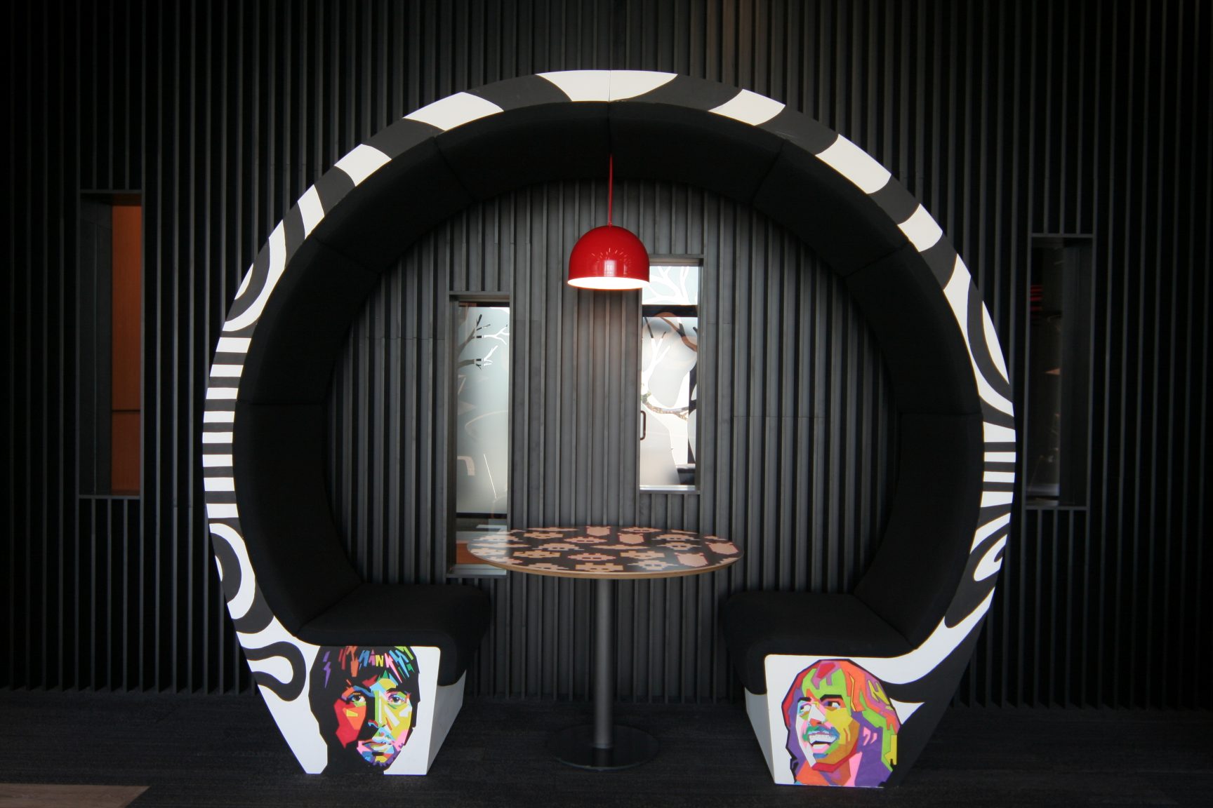El mobiliario introduce colores vivos para contrastar, como el rojo del logotipo y otras piezas de diseño. Las cabinas de reunión curvas son un punto destacado, combinando blanco y negro con ilustraciones estilo pop art para un toque artístico y lúdico.