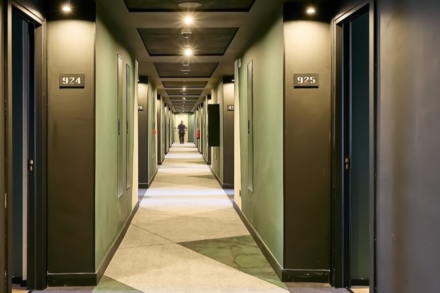 Application : Hall d'entrée, toit-terrasse, salles de réunion, espace buffet et portes des chambres