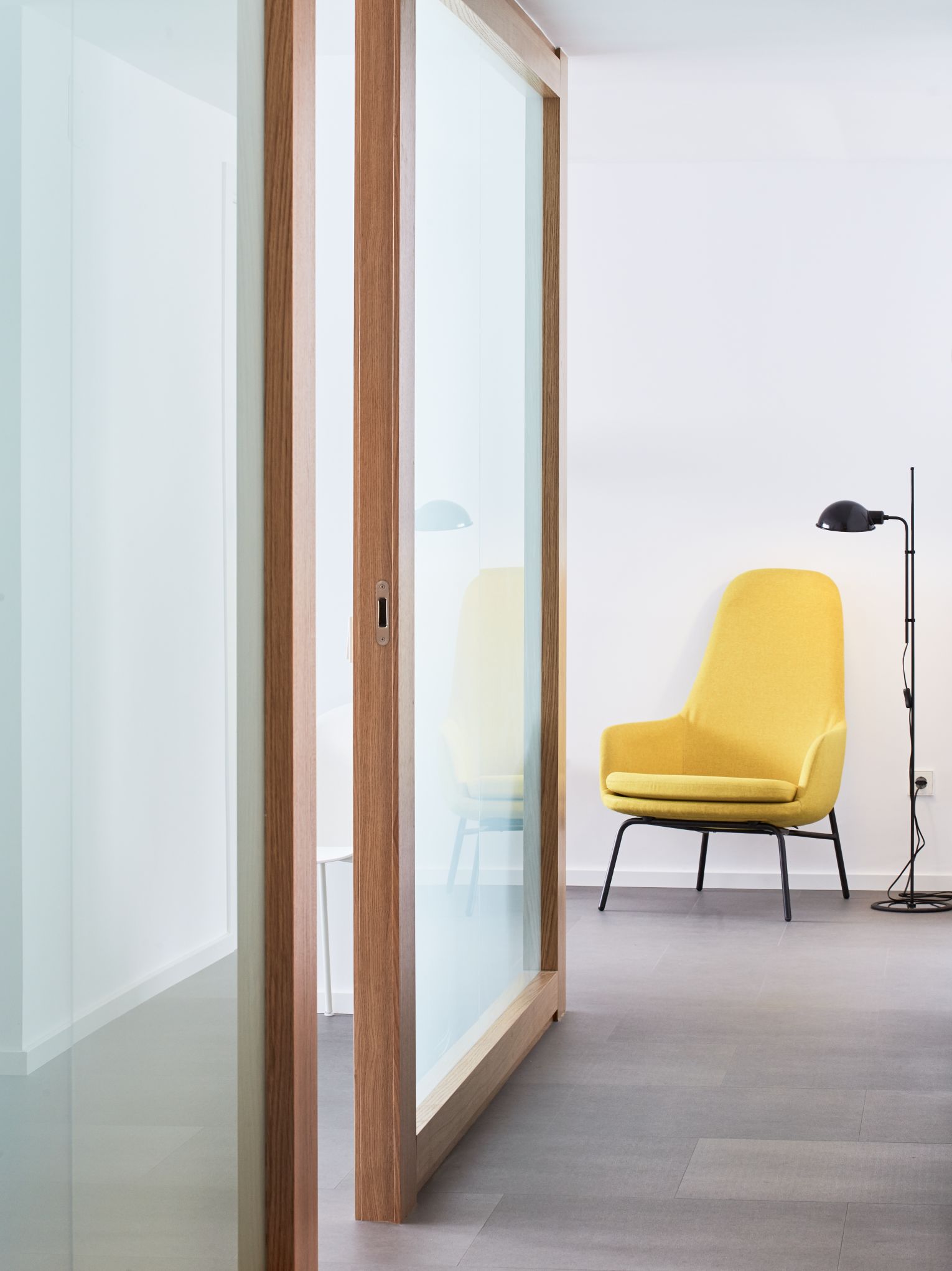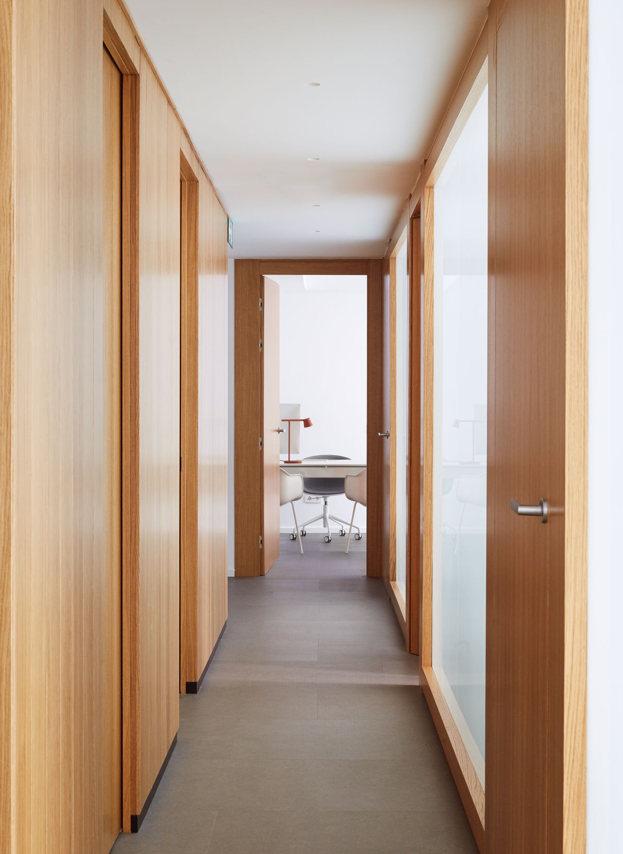 Para facer isto, Kommo Design Studio optou pola madeira de carballo natural combinada con paredes e mobles brancos e un chan gris claro para todas as salas da clínica. A escolla destes materiais, xunto coa creación dunha gran ventá acristalada que proporciona luz ao corredor central, permitiu acadar o obxectivo de crear espazos luminosos e acolledores, facendo que a estancia dos pacientes sexa máis agradable.