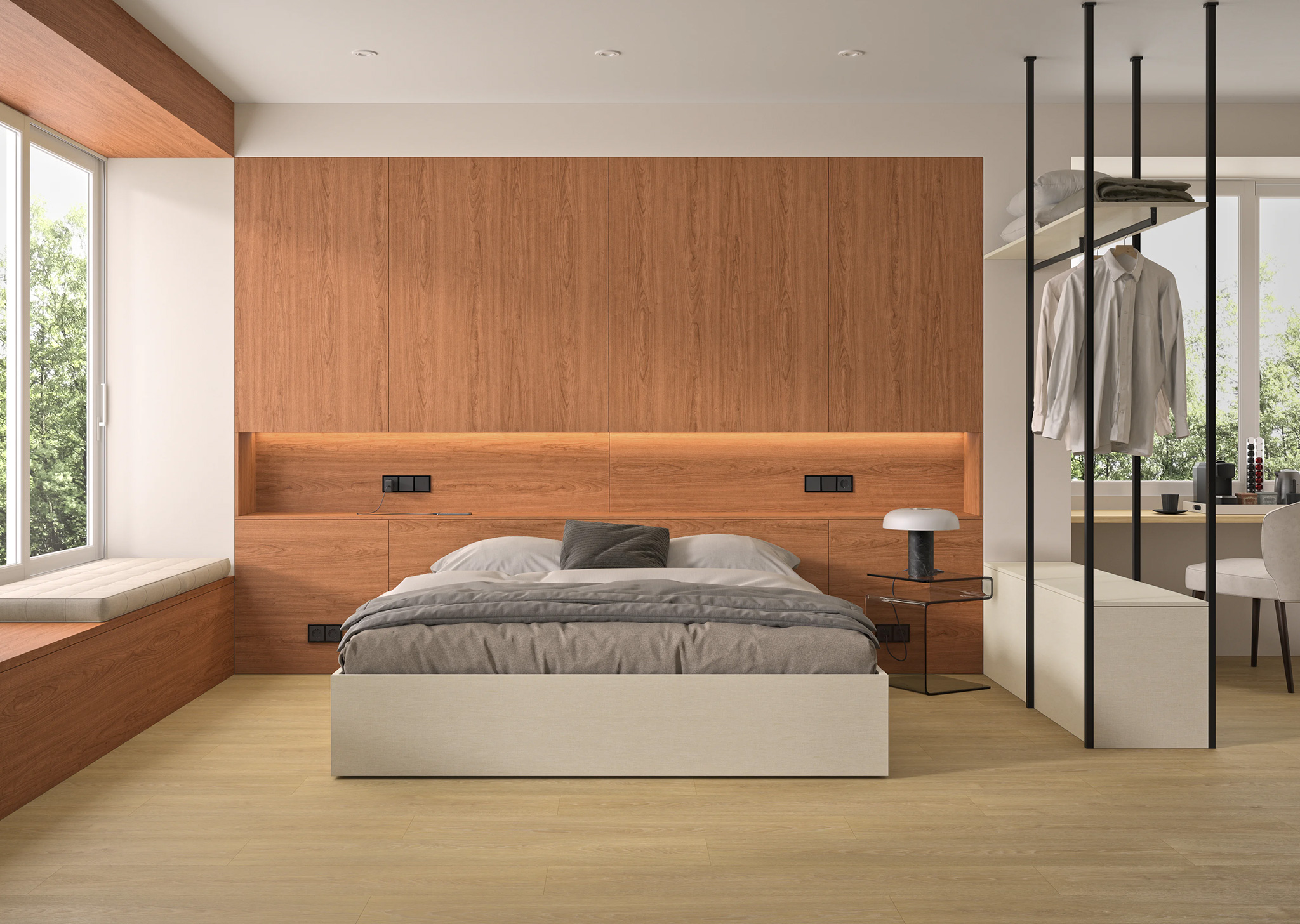 Il pannello decorativo della gamma Duo , Cerezo Canela nella finitura Mesura, offre una reinterpretazione calda e sofisticata del legno di ciliegio, con un design dalle venature morbide e ondulate che dona movimento senza eccessi. Il suo motivo lineare, con ampie cattedrali e pori fini, bilancia tradizione e modernità, trasmettendo un senso di serena eleganza. La finitura Mesura combina diverse dimensioni e profondità, con una sensazione setosa e un moderno livello di lucentezza.