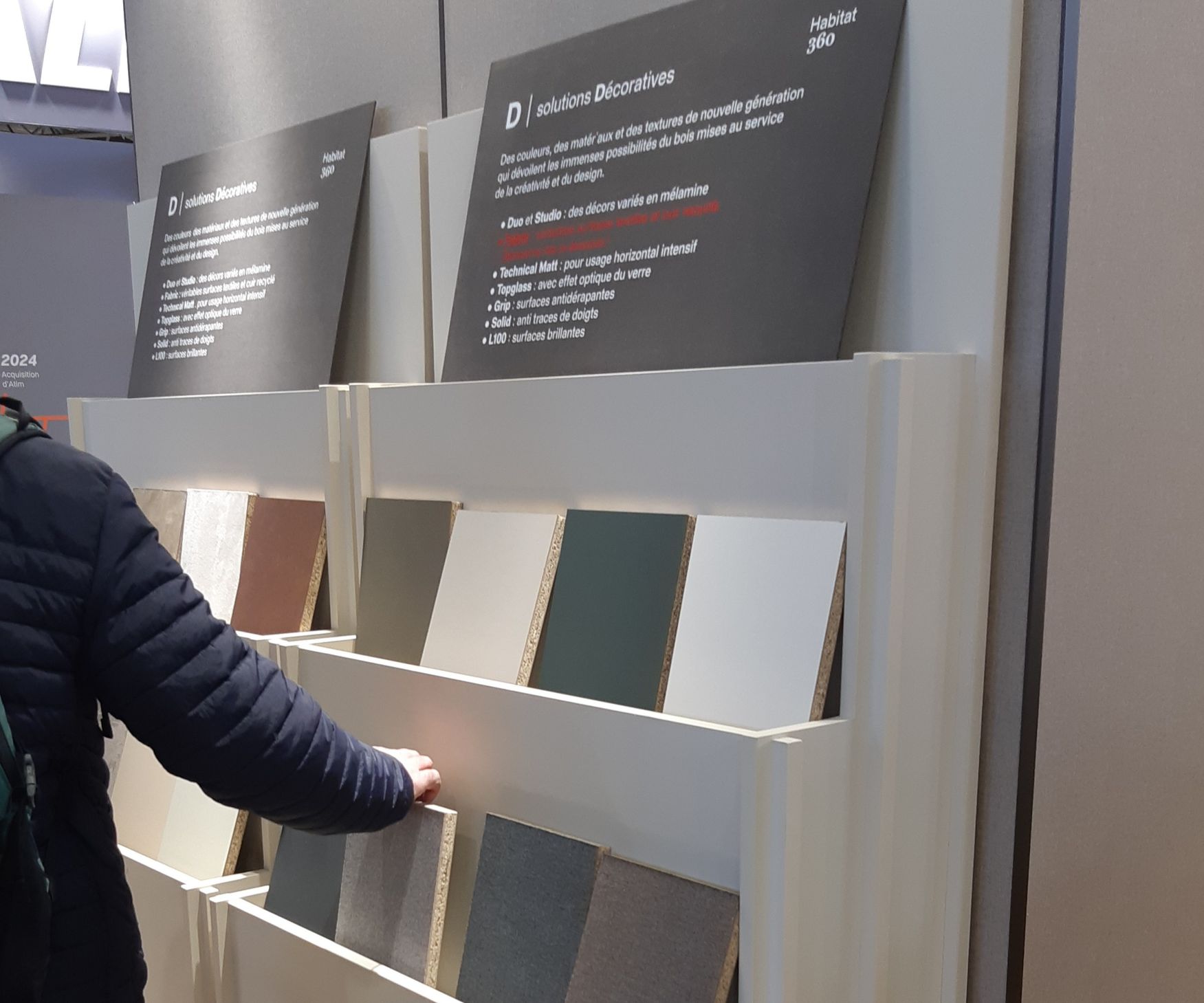En lo que concierne a producto, el stand muestra una gran variedad de materiales. Así, presentamos 63 diseños de Superficies Decorativas, 46 chapas de Superficies Decorativas Naturales, 17 referencias de Paneles Texturizados y 13 muestras de Paneles Decorativos. Asimismo, todo el stand en sí ha sido realizado íntegramente con soluciones de Habitat 360.