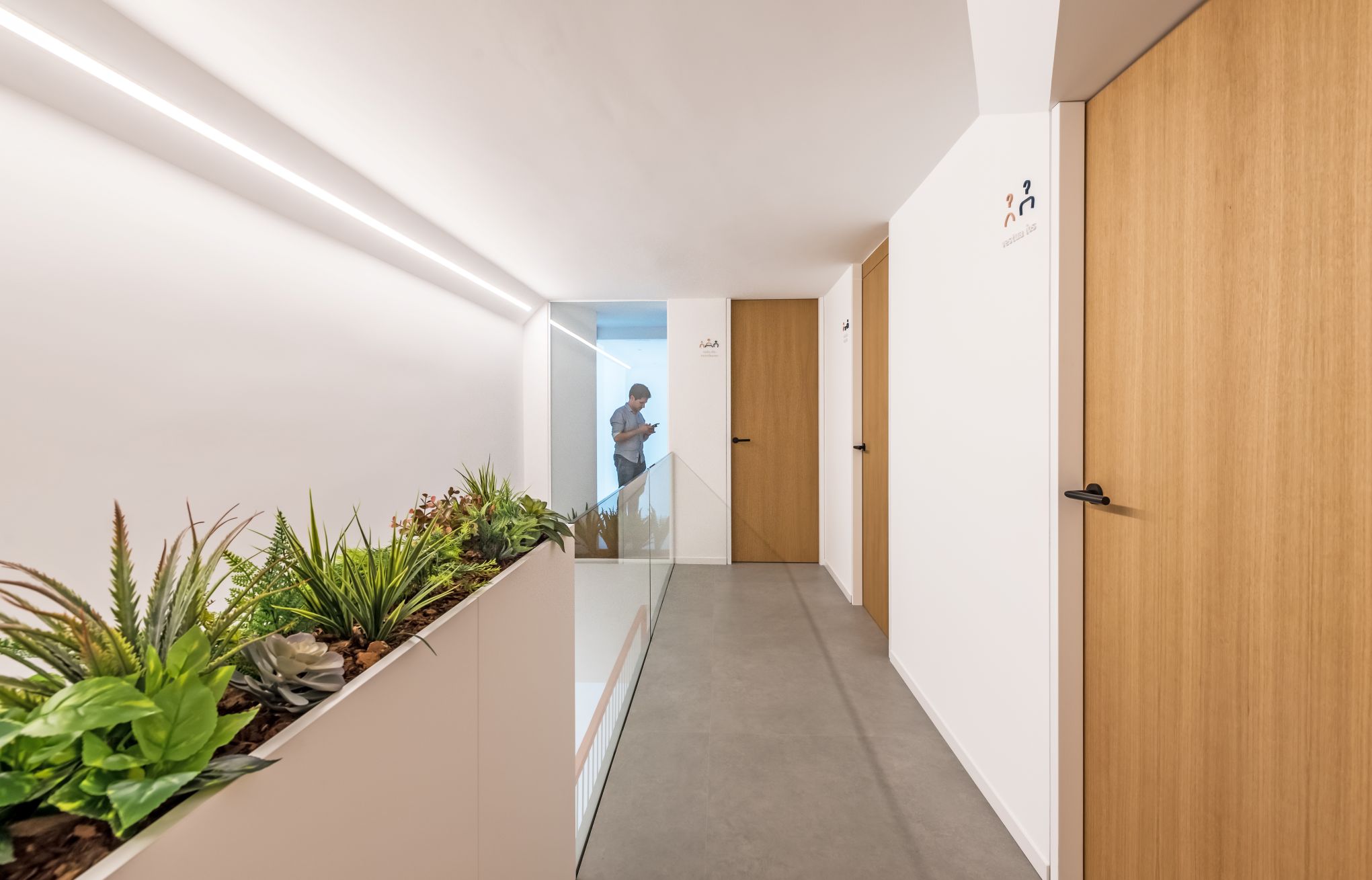Dlatego planując, Pracownia architektoniczna Comisura Dental Clinic zdecydowała się na fasadę z roślinnością. Tworzy subtelne oddzielenie między strefą recepcji a poczekalnią, które w połączeniu z dużymi oknami tworzy bardzo przyjazną atmosferę, jak tylko wszedłem do kliniki. Białe i jasne powierzchnie dębowe przyczyniają się do stworzenia tej przyjaźnej atmosfery i przyjemności dla pacjentów.