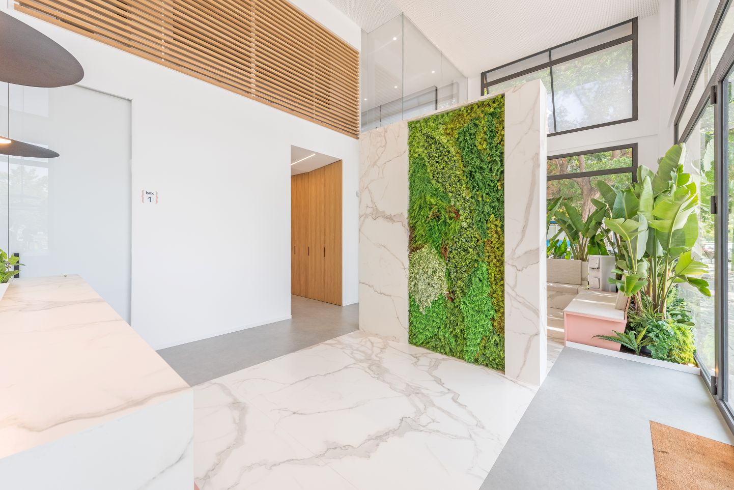 Roble Hera to wszechstronny materiał dekoracyjny, który emanuje spokojem i nowoczesnością. Doskonale nadaje się do tworzenia jasnych i przyjaznych przestrzeni, takich jak klinika stomatologiczna Comisura.