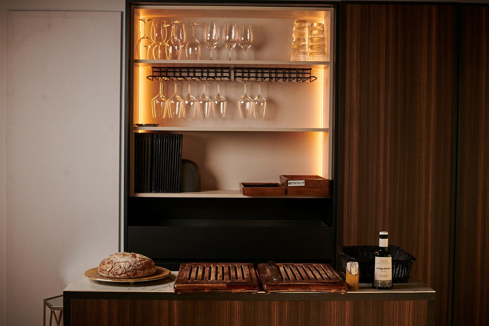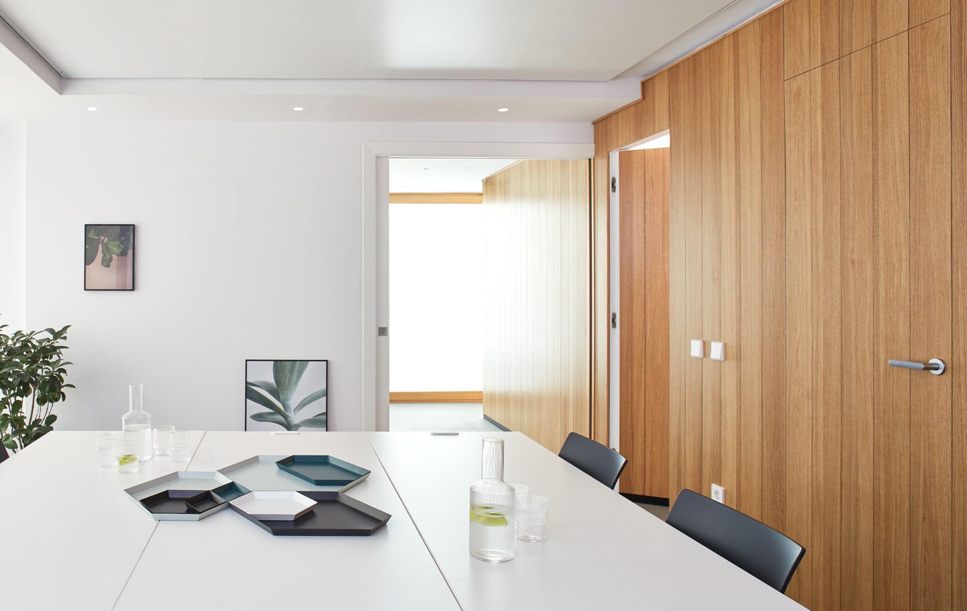 Wśród tych dekoracyjnych powierzchni znajdują się materiały firmy Finsa. Konkretnie, zarówno w recepcji, jak i w częściach wspólnych możemy zobaczyć dekor FibraPan® Decor Dąb Roble Hera Atlas, który został użyty do paneli i drzwi.