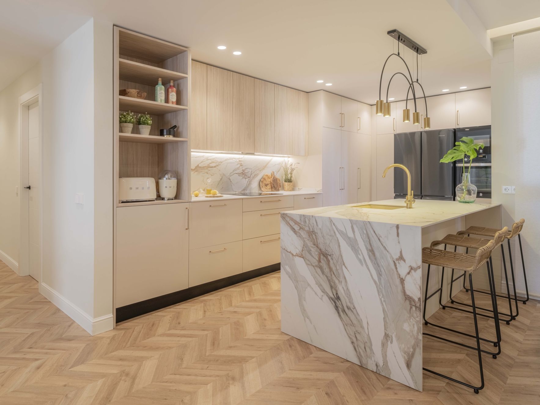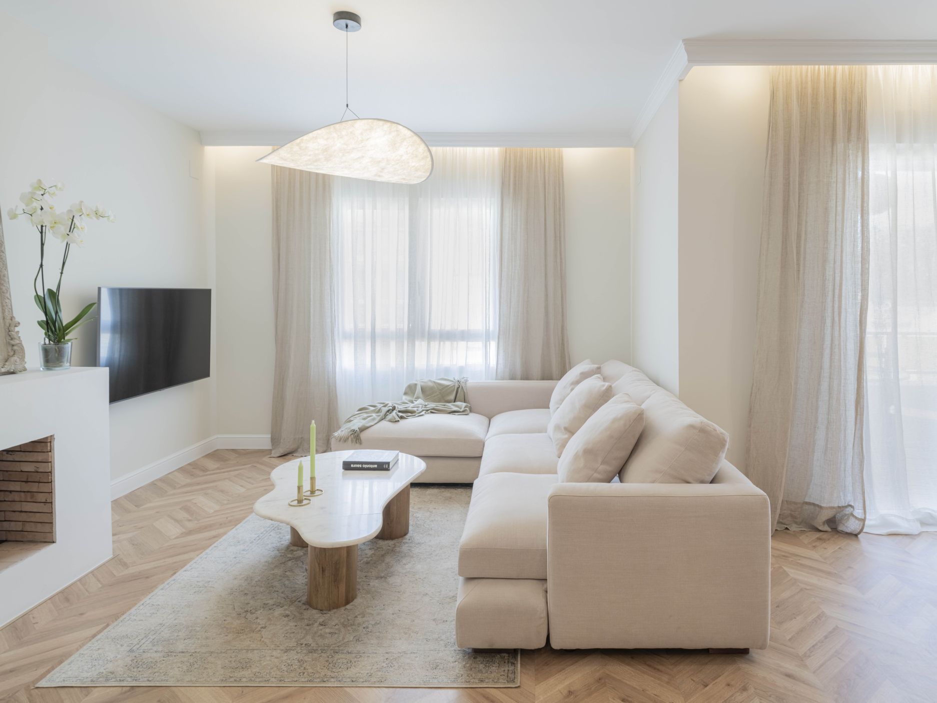 Jednym z kluczowych aspektów tego projektu renowacji jest zerwanie z tradycyjnym podziałem i koncepcją zabudowy mieszkaniowej, która dawniej była bardzo podzielona. Dzięki tej kompleksowej interwencji cała dzienna część pomieszczenia — salon, jadalnia i kuchnia — jest ze sobą połączona, tworząc jasną, przyjazną i funkcjonalną przestrzeń. Pokoje te są wizualnie połączone, ale funkcjonalnie oddzielne.