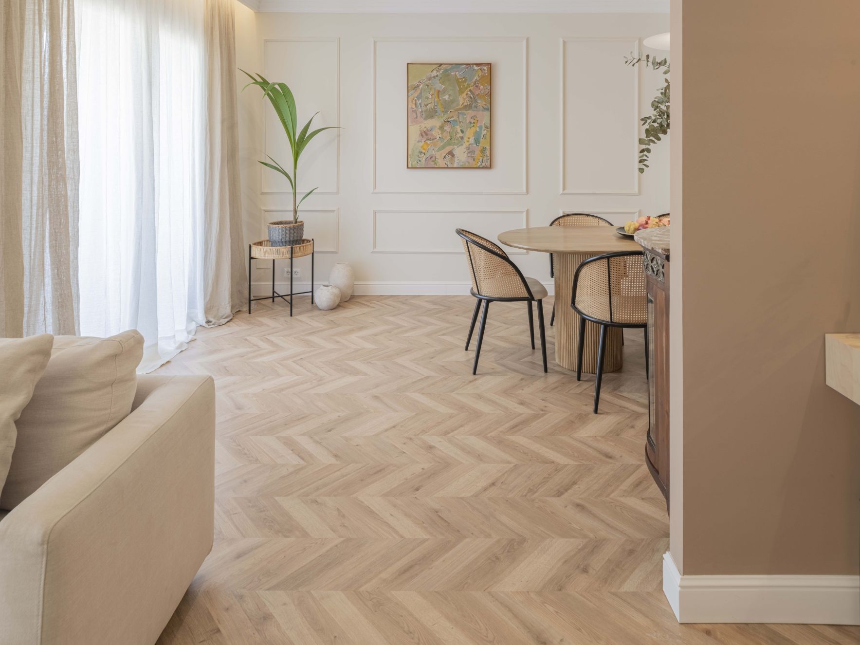 To wizualne połączenie pomieszczeń udało się uzyskać przede wszystkim dzięki podłodze laminowanej, która jest taka sama w salonie, jadalni i kuchni. To jest o tym Finfloor Supreme Espiga Orleans to projekt reinterpretujący tradycyjny wzór jodełki staromodnych parkietów, łagodzi jego rustykalny wygląd dzięki naturalnemu odcieniowi. Dlatego wybór tego projektu był logiczny – utrzymano w klasycznym stylu, ale dodano nowoczesne akcenty.