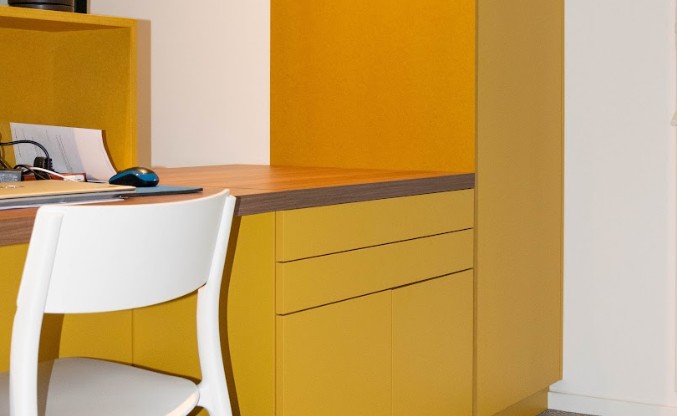 A mesma energia se estende para outras áreas da clínica através dos móveis. Os detalhes FibraColour® EZ Amarillo integram-se aos armários e outros elementos funcionais, mantendo a coerência estética e proporcionando um toque moderno. A combinação com superfícies e texturas de madeira mais escura no piso cria um contraste visual atraente, sem prejudicar a cor principal.