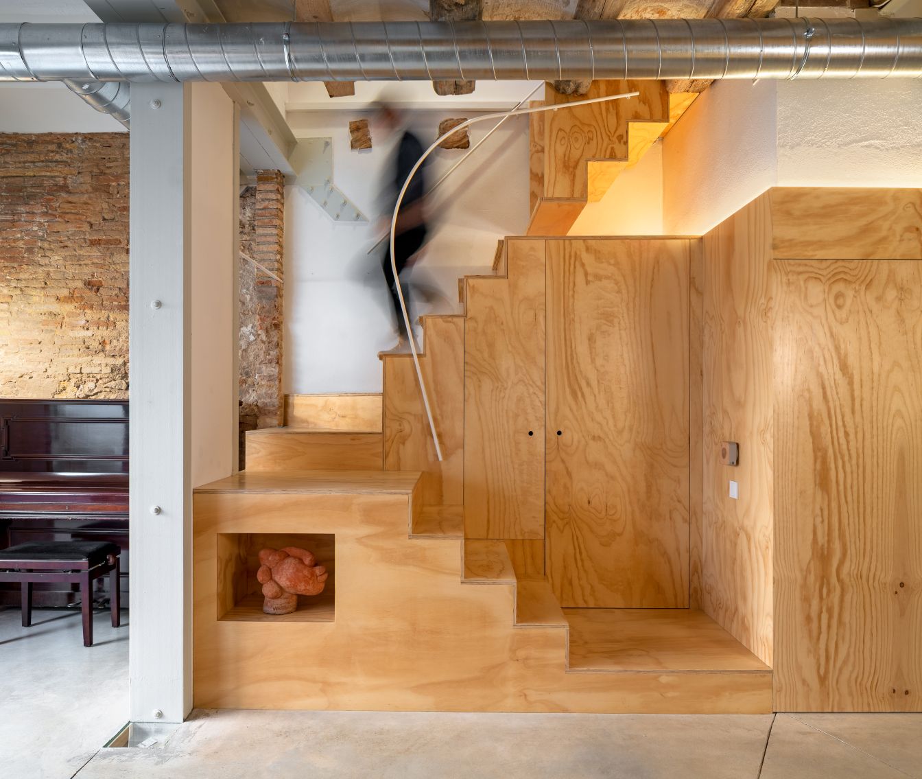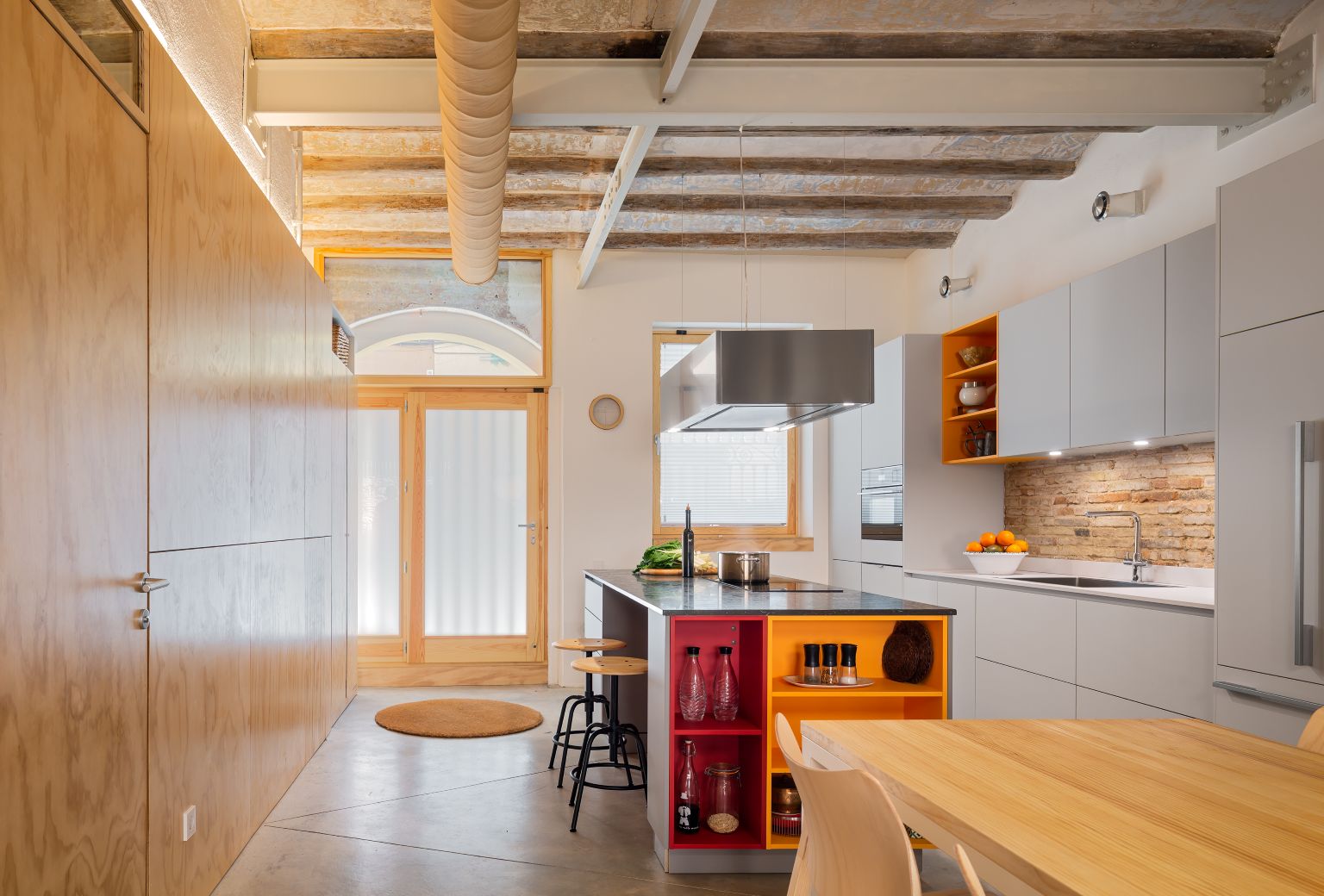 Detalhes como tetos com vigas expostas e dutos acrescentam um toque industrial que contrasta com o calor da madeira.